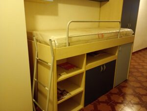 Cameretta mod. ” Polo2 ” in laminato faggio e blu/azzurro, armadio, letto e scrittoio a scomparsa.