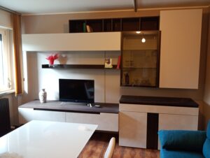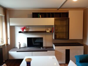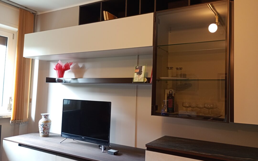 Soggiorno Slim up Laccato effetto resina light grey/rovere termotrattato con illuminazione led-Misura cm. 320X235X prof. 58/48/38 cm.